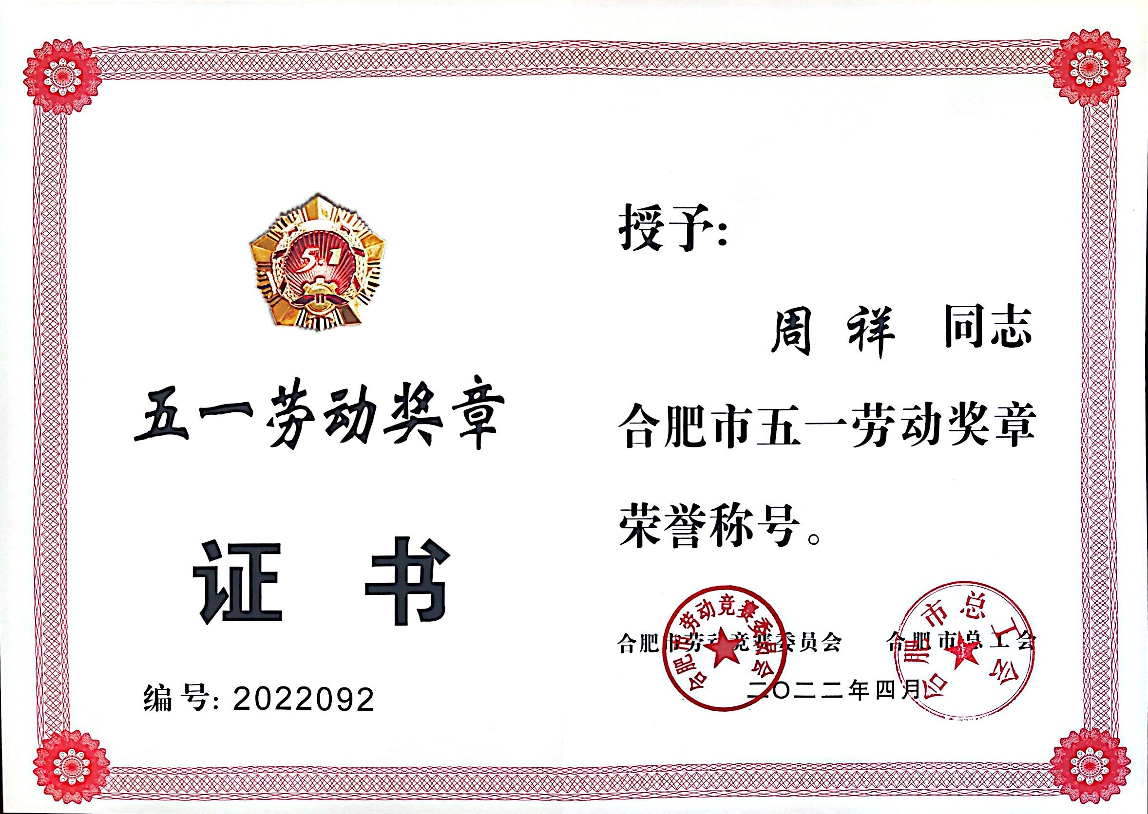 | 熱烈祝賀中寶公司周祥同志榮獲合肥市五一勞動(dòng)獎(jiǎng)?wù)?/td>